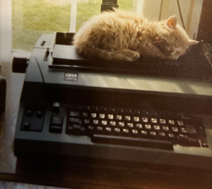 Photo ~1978. Taken weeks after my mom started her business. Our kitten, Tom, didn’t care that her typewriter was expensive or high-tech, more that it offered a warm spot in the sunshine.